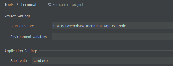 그러면, Shell path가 눈에 들어오는데요. cmd.exe라고 되어 있습니다. 이는, Pycharm에서 터미널을 누르면 띄우는 shell이 cmd라는 의미입니다. 이것을 git으로 바꾸고 싶습니다.