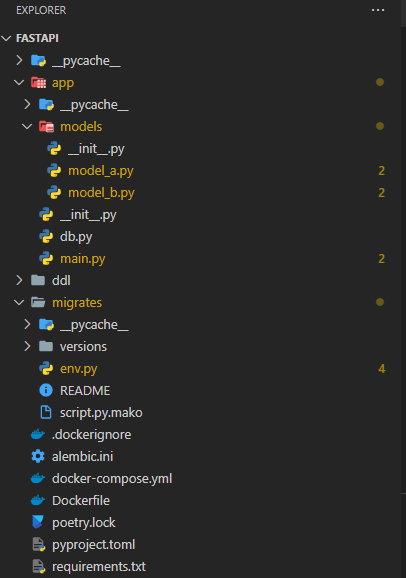 먼저 프로젝트의 구조입니다. models 안에 __init__.py와 model_a.py, model_b.py가 있습니다. 다음에, env.py가 있습니다. 저는 이 4개의 파일만 건드릴 겁니다.
