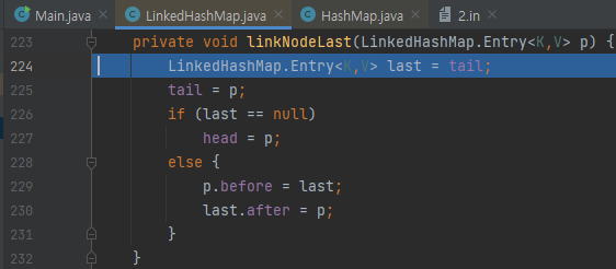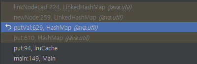 putVal 메소드를 잘 보면 newNode를 생성하는 부분이 있습니다. 이 부분을 디버그 하면서 따라들어가다 보면, LinkHashMap의 linkNodeLast 메서드를 부르고 있음을 알 수 있습니다.
