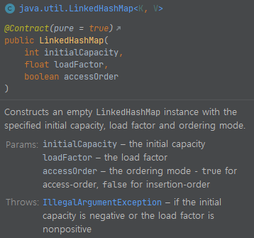 여기서, accessOrder의 설명을 봅시다. ordering mode를 의미한다고 되어 있어요. 만약에 이 값이 true면 AfterNodeAccess, 즉 접근하고 난 후 노드 처리를 하는 메서드와, AfterNodeInsertion, 노드를 추가하고 난 후의 처리를 하는 메서드를 호출하게 됩니다. 이 클래스의 공식 문서를 뒤져가면서 찾아보면 removeEldestEntry 메서드가 있어요.