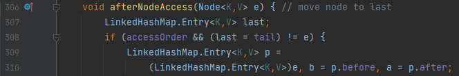그러면 접근을 한 것에 대해서는 어떻게 처리될까요? 당연하게도, 노드에 접근해서 맨 뒤로 밀어버릴 겁니다. e가 어디로 밀어지는지 보면 되겠는데요. 310번 줄에서 p = e, 가 있으므로, p가 어디로 가는지 보면 되겠습니다.