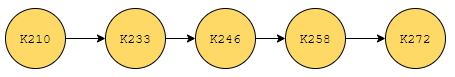 예를 들어 ~역이 K258이고 ~역이 K272라면. 이 구문이 있습니다. '예를 들어' 라던지, for example 이런 것은 언어 계열 문제들을 풀 때 도움이 되는지 개인적으로 잘 모르겠습니다만, 코딩 테스트에서는 결정적인 힌트가 될 수 있습니다. 이 정보를 통해서 어떻게 도식화를 시킬 수 있는지 봅시다. K258, K259, ... , K272 순서로 멈추게 된다. 이러한 구문이 있어요. 그러면 일단, 아래와 같이 도식화를 시킬 수 있어요.
