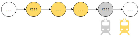 이런 구조의 역이 몇 개 있다는 것입니다. 그림 3에서 언급된 K232와 K233이 이에 속합니다. 하행 열차 둘이 같은 시각에 동시에 있을 수 있는 구조입니다. 그러니, 특정 조건이 없으면 열차가 겹칠 수 있는 상황이 벌어질 수 있고, 추가적인 서술이 없다면 계속 열차가 겹치는, 상식적으로 말이 안 되는 상황이 발생할 수 있어요. 서술이 매우 복잡해 질 것은 자명했습니다.