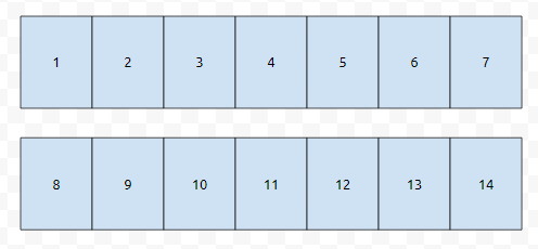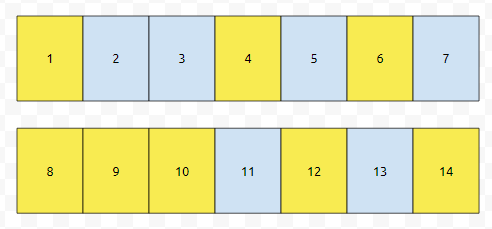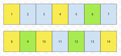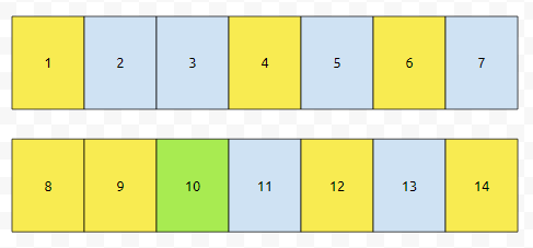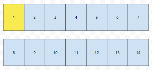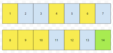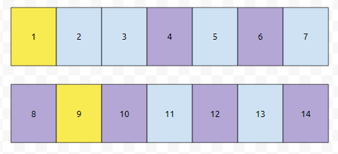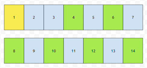 7은 어떤가요? 탐색을 할 때, 하늘색이기 때문에 소수입니다. 이 때 7이 아니면서 7의 배수인 것을 모두 방문했다는 처리를 합니다. 이런 식으로 2부터 14까지 쭉 돌다보면, visit 처리를 안 한 수는 2, 3, 5, 7, 11, 13임을 알 수 있어요. 이들은 모두 소수임을 알 수 있습니다.