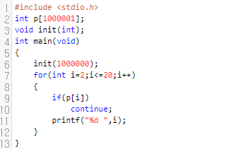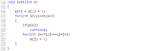 이제 간단하게 에라토스테네스의 체 알고리즘의 코드를 봅시다. 제가 설명한 대로 구현을 했습니다. 일단, 보시면 p[i]가 0이 아닌 경우는 continue 한 걸로 보아서는, p[i]는 방문 상태를 검사하기 위한 것인가 봅니다. 그리고, 그게 아니라면, 21번째 줄의 for loop를 수행하는데요. i의 배수이면서 i가 아닌 수들을 모두 visit 상태로 만들어 버림을 알 수 있어요.