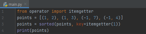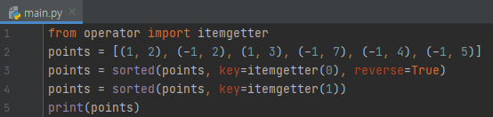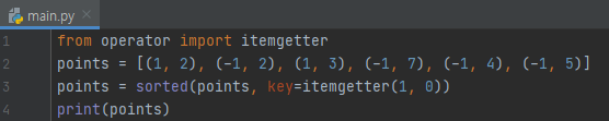 그럴려면 단순하게, itemgetter(1, 0)을 입력해 주시면 됩니다. 그러면 각각 순회를 하긴 할 텐데, 1번째 원소, 0번째 원소를 기준으로 키를 뽑아올 겁니다. 1번째 데이터는 (2, 1), 2번째 데이터는 (2, -1), ... 이런 식으로요. 즉, 1번째 원소를 1순위로, 0번째 원소를 2번째 기준으로 뽑아올 겁니다.