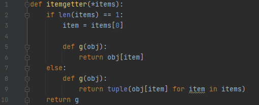 대충 요런 함수인데요. 일단은 뭔가 리턴하는데 g를 리턴해 버립니다. 그리고 이 g는 obj를 받습니다. 이로 미루어 보았을 때, 함수 itemgetter는 호출 함수인 caller를 리턴하고, 이 caller가 실제로 iterable한 놈을 넘겨받아서 x번째 원소를 리턴하는 일을 수행한다고 봐도 되겠군요. 그러면 이걸 어떻게 바깥에서 쓸까요?