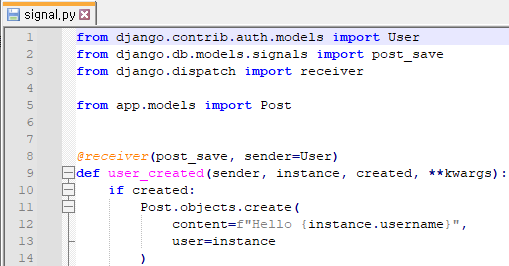 다음에, signal.py에는 요렇게 작성해 주겠습니다. 여기서 signal 이름은 post_save입니다. 그리고 sender는 User입니다. 시그널을 보내는 주체 정도라고 생각하시면 되겠습니다.