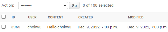 post 테이블을 보니 Hello chokw3이라는 내용이 들어간 글이 생성되었습니다. 여담으로 설정값 중에 dispatch_uid라는 값이 있는데요. 이것은 이 부분을 잘 읽어보시면 도움이 되실 듯 합니다.