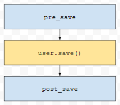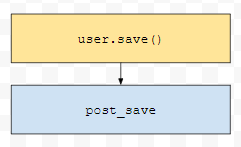 그러면, user_created 함수가 생성됨을 알 수 있는데요. created 필드가 False인 것을 확인할 수 있어요. 이는 유저가 create 되는 것이 아니라, 수정된 것이기 때문입니다. 이제, post_save를 이야기 해 봅시다. post_save는 save() 메소드가 호출된 직후에 일어납니다. 이를 도식화 시키면 아래와 같습니다.