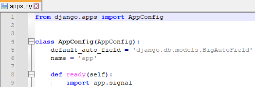 먼저, apps.py에 있는 AppConfig를 봅시다. 여기에서 ready 메소드를 override 합시다. ready 메소드에는 app.signal을 import 하겠습니다.