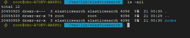 디폴트로 설정 되어 있는 디렉토리로 가서 ls -ail 명령어를 날려 보겠습니다. 그러면 파일/디렉토리에 . 이라고 찍혀져 있는 것이 보이실 겁니다. 이것은 현재 디렉토리를 의미합니다. 이것의 권한, 소유자, 그룹 등이 있는데요. 소유자와 그룹이 둘 다 엘라스틱 서치임을 알 수 있습니다. 권한값 중에 s는 리눅스 카데고리에서 다시 언급을 하도록 하겠습니다.