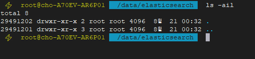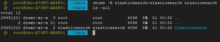 그러면 기본적으로 path.data의 값은 /var/lib/elasticsearch이고, logs의 값은 /var/log/elasticseaerch입니다. 이 기본 값들은 메모를 해 두는 것이 좋습니다. 최상위 디렉토리에 data 디렉토리를 생성하고, 그 안에 elasticsearch를 생성하였습니다.