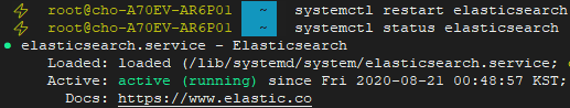 그러면, 명령어를 data 폴더에 가셔서, chown -R elasticsearch:elasticsearch elasticsearch 이렇게 입력하시면 됩니다. 이는 엘라스틱서치에 있는 하위 폴더들과 파일들에 대해서, 소유자와 소유 그룹이 ES인 속성을 적용합니다. 이제 서비스를 재시작 해 보겠습니다.