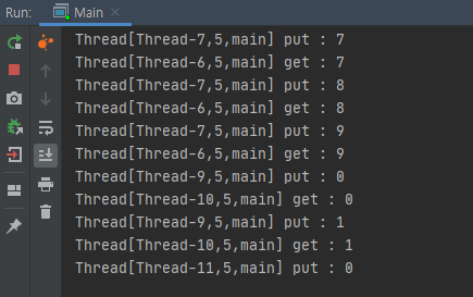 먼저 notify 메서드에 대한 설명을 보겠습니다. 깨우는데, a single thread라 되어 있습니다. 하나의 스레드를 깨웁니다. Object의 모니터에 대해서? Common의 get이나 put에는 wait가 있었는데요. main 클래스에 보면 이런 것이 있었습니다.
