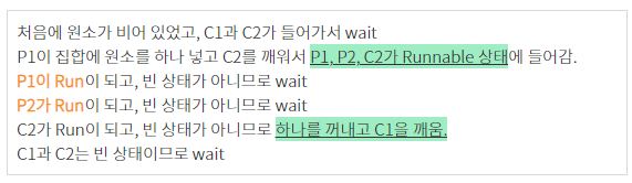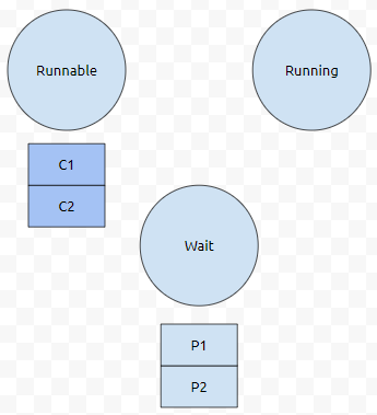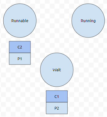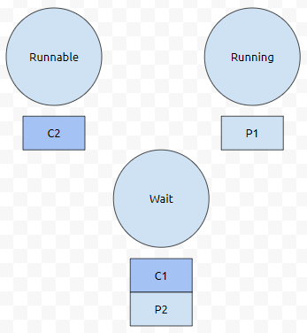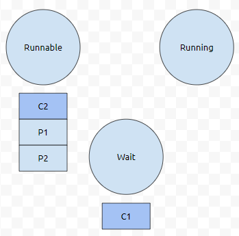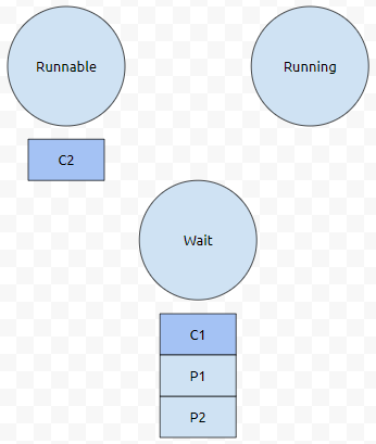 그러므로, C2는 원소 하나를 가져온 다음에 notify를 호출할 것이고, P1, P2, C1 중에 하나를 깨울 겁니다. 원소가 하나 비어 있는 상태에서 Runnable한 것은 C2와 C2가 깨운 무언가일 겁니다.