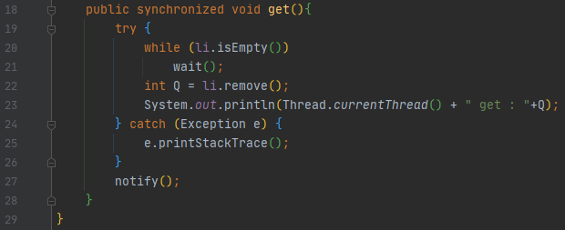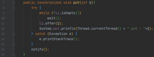 먼저, put 메서드입니다. list가 비어있지 않으면 기다리고, 그렇지 않으면 원소를 넣고 하나를 깨웁니다.