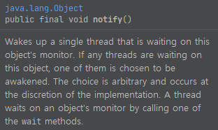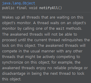 여기서 질문. 이펙티브 자바에서 언급된 'notify를 삼켜서 꼭 깨어났어야 하는 스레드가 대기해야 하는 상황이 발생한다'는 어떤 의미일까요? 이 글의 내용을 조금 더 응용하면 되니, 답은 생략하도록 하겠습니다.