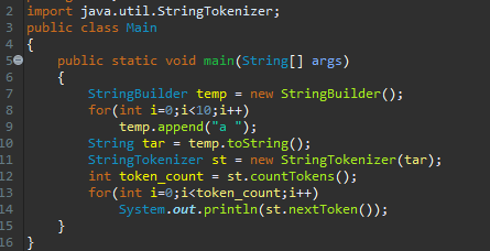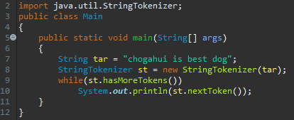 보통, 문자열을 분리하기 전에, countxxx를 호출을 합니다. 12번째 줄에서, 공백이나, 탭 등등을 구분자로 했을 때, 분리되는 것의 갯수를 token_count에 넣어 놓았습니다. 그리고, 13번째 for문을 돌면서 nextToken으로 계속 분리된 문자열들을 리턴하고 있어요.