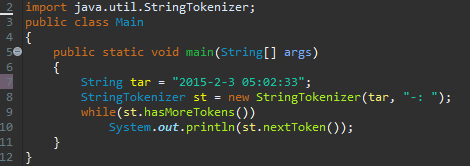 8번째 줄을 봅시다. target 문자열을 가지고, 2번째 인자에 나온, 구분자들, '-', ':', ' '을 가지고 분리하겠다는 겁니다. 보시면, hasMoreTokens 라는 메서드가 있다는 것을 알 수 있는데요. 이것은, 구분자로 인해 잘라진 토큰이 더 있는지를 검사하는 함수입니다.