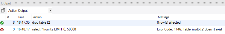 스키마 목록에 t2가 사라진 것을 볼 수 있습니다. 그러면 select * from t2 쿼리를 수행하면 어떻게 될까요? 이는 t2 스키마에 있는 레코드들을 모두 출력하라는 의미인데요. t2가 없습니다.