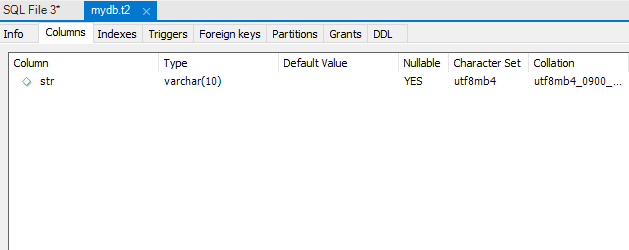 그러면, 테이블에 대한 데이터는 남아 있음을 확인할 수 있어요. 예를 들어, str 필드의 type이 무엇인지, Character set이 무엇인지 등등은 남아 있습니다.