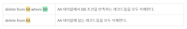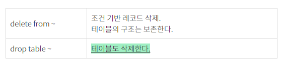 오늘 배운 내용을 표로 정리해 보면 위와 같습니다. 교과서에는 delete from ~ 보다 drop table ~ 가 더 극적인 작업이라고 되어 있습니다. 이 문장만 기억하셔도 될 듯 싶네요.