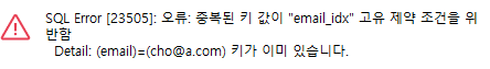 다음에, 이 쿼리를 수행하면 어떻게 될까요? 4, 5번은 별 문제가 없어 보이지만, 6번에서 문제가 발생합니다. 왜냐하면, 이미 데이터 'cho@a.com'가 있기 때문입니다.
