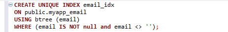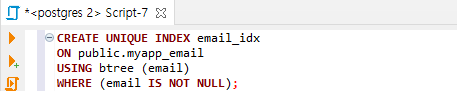 email 관련 model을 migrate 하고, dbeaver에서 DDL을 조회해 봅시다. 그러면 이런 DDL도 있음을 볼 수 있는데요. 1번째 줄부터 천천히 해석해 봅시다. email_idx라는 unique index를 생성한답니다. 그런데, public.myapp_email에 대해서. btree를 쓴다네요. 그런데, 4번째가 중요합니다. where 절을 보면 email이 not null인 경우만 적용된다는 의미에요.