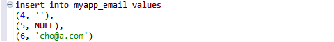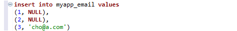 이 쿼리는 잘 작동합니다. 왜냐하면, NULL인 경우, unique 제약 조건이 걸려있는 인덱스에 indexing이 되지 않기 때문입니다. 다음에, 3번째 'cho@a.com'이 들어갑니다. 그러면 인덱스에는 'cho@a.com'만이 들어갑니다.