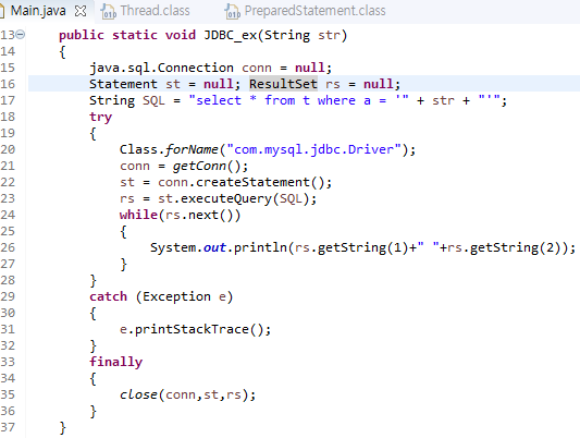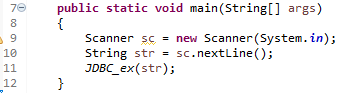 딱히 어려운 것은 없고, Statement라는 것이 있고, 이것은 SQL을 집어넣습니다. 그런데, SQL은 where a' 라는 문자열과 str과 '가 있는 문자열을 연결하고 있어요. str은 어디서 들어올까요?