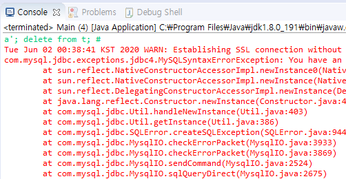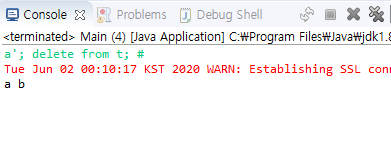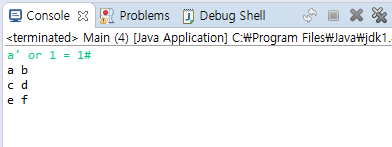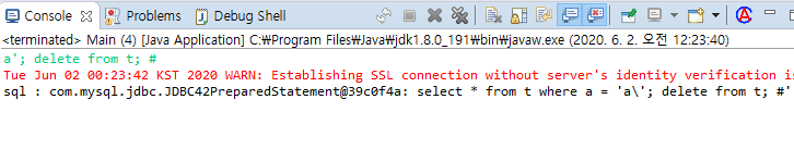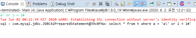 a' or 1 = 1#을 입력하면 프로그램 1에서는 모든 데이터가 출력되었습니다. 그런데, 프로그램 2를 수행시켜 보니, 아무것도 출력이 되지 않았습니다. 이게 어떻게 된 일일까요? SQL문을 출력해 보겠습니다. logger를 쓰는 게 best이기는 합니다만..