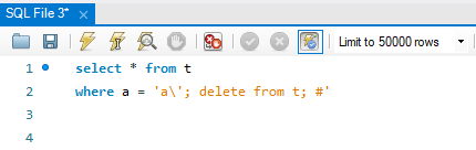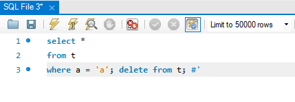 a' or 1 = 1# 이라고 입력해 봅시다. mysql에서 주석은 #이거든요. 이렇게 입력하고 엔터를 누르니까, 테이블 t에 있는 전체 데이터가 출력이 되어 버렸습니다. 왜 그럴까요? 이유는 간단합니다. SQL 문이 아래와 같이 되어버리기 때문입니다.