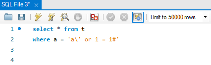 먼저 a' or 1 = 1 #을 입력했을 때입니다. Query가 보이는데요. ' 앞에 \가 붙었음을 알 수 있습니다. escaping이 되었다고 이야기 합니다. 이 쿼리를 알아보기 쉽게 workbench에 옮겨보도록 하겠습니다.
