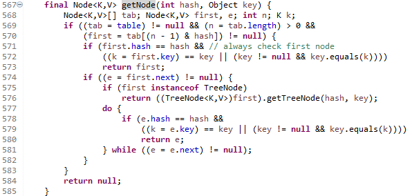get 메서드의 내부를 보겠습니다. getNode 메서드의 리턴 값이 null이면 null을 리턴합니다. 그렇지 않으면 e.value를 돌려줍니다.