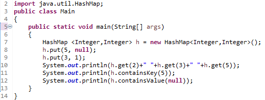 먼저, 10번째 줄을 보겠습니다. 2라는 키는 없습니다. 따라서 null이 출력될 겁니다. 이는 크게 문제 없습니다. 3이라는 키는 5라는 값과 쌍을 이루고 있기 때문에 5가 나옵니다. 여기까지는 별 문제가 없습니다. 그런데, h.get(5)가 문제입니다. 5라는 키가 있지만, null을 가지고 있기 때문에 널이 출력됩니다.
