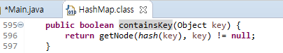 반면에 containsKey는 getNode의 리턴 값이 null이 아니면 true를, 아니면 false를 리턴해 줍니다. 그러면 이 메서드는 어떻게 수행이 될까요? HashMap에서 어떻게 수행되는지 보겠습니다.